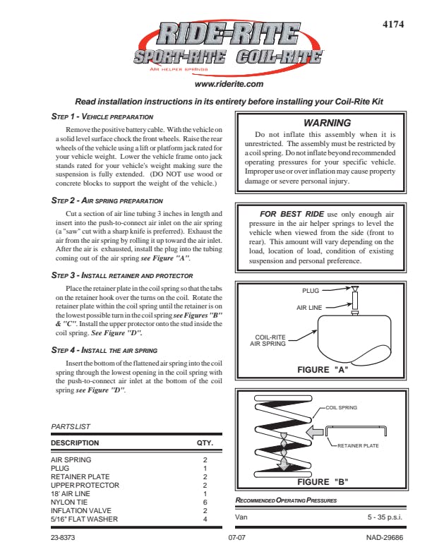 If you're looking for a smoother ride for your vehicle that has a coil spring suspension, Firestone Coil-Rite air helper springs are what you need. Designed to fit inside existing coil springs to create a variable spring rate, Coil-Rite will level your vehicle and assist with more effective braking and handling, even under heavy loading and adverse road conditions.Coil-Rite enables you to control the air pressure in the air helper springs so you can make adjustments for varying loads and road conditions. Spring performance can be altered as easily as inflating a tire.Firestone Coil-Rite air helper springs are made of durable, elastic polyurethane, providing years of comfort and stability to your vehicle. The air springs will support 500-1000 lbs. per set (not to exceed vehicle's GVWR). Coil-Rite Air Helper Springs are designed to work in temperatures between 180 °F (82 °C) and -40 °F (-40 °C).